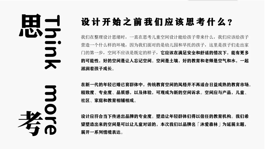 設(shè)計(jì)思考:在新一代的年輕群體中,傳統(tǒng)教育空間的風(fēng)格并不再適合日益成熟的教育市場(chǎng)。精致度、專業(yè)度、品質(zhì)感,以及體驗(yàn),可觀成為新的空間訴求??臻g應(yīng)與產(chǎn)品,兒童、社區(qū)、家庭和教育相輔相成。設(shè)計(jì)應(yīng)符合當(dāng)下傳遞出品牌的專業(yè)度。塑造讓年輕群體們得以信任的教育機(jī)構(gòu)。我們希望塑造出來(lái)的空間是可以讓兒童對(duì)話的,本次我們以品牌名「沐愛(ài)森林」為延展主題,展開(kāi)一系列情境表達(dá)。