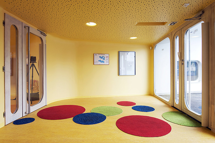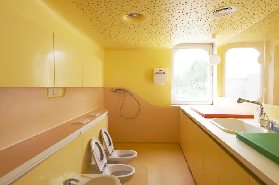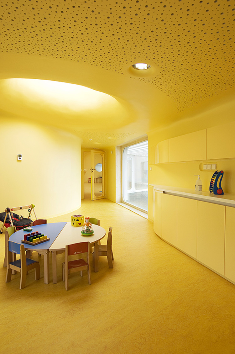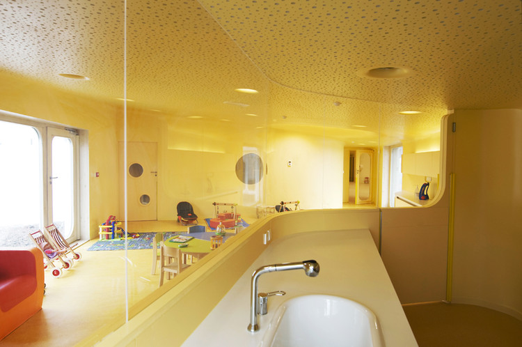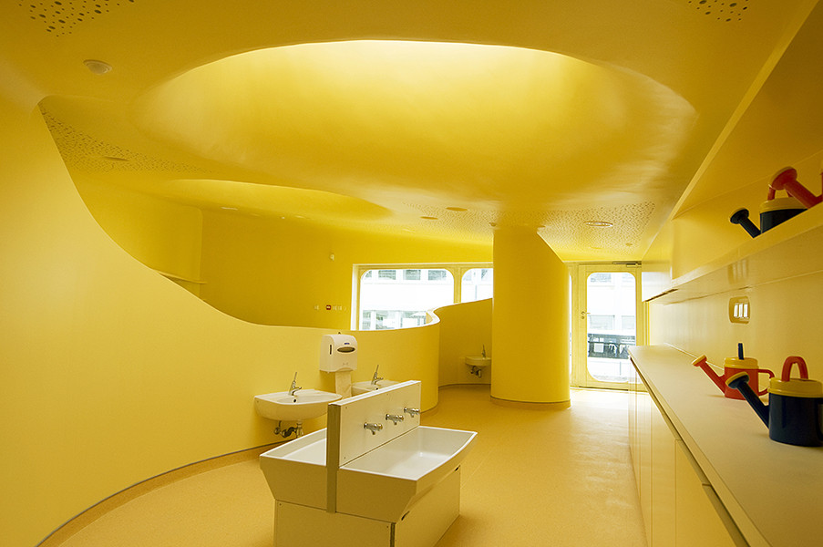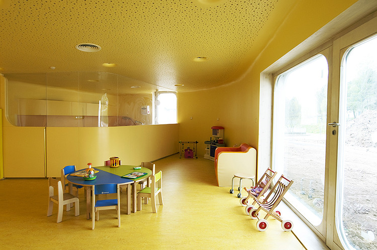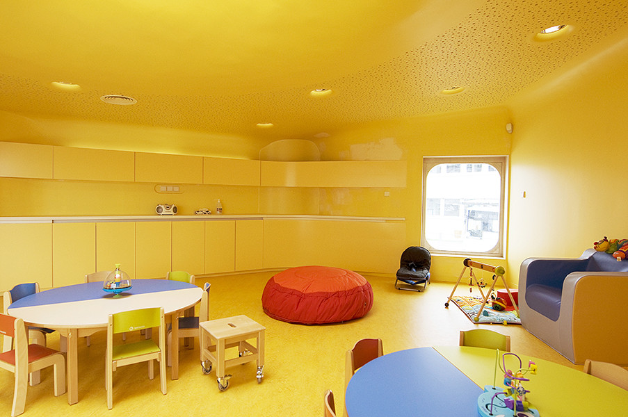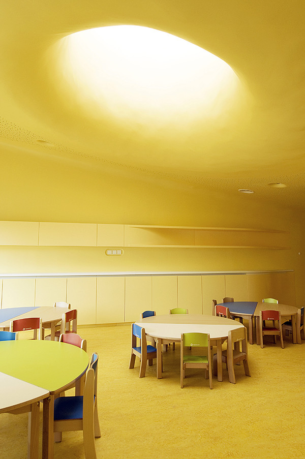 此外雨水管位于建筑側(cè)面,這樣家長們永遠(yuǎn)不用抱起孩子跨過水溝。內(nèi)部空間的組織都圍繞著高度安全的圓形中央空間,孩子們的空間圍繞并匯聚于此。每個相鄰的空間都彼此連通便于相互照料,最大程度的保證了安全。中心帷幕似的木結(jié)構(gòu)最高處是3米寬的聚碳酸酯拱形天花板,保證室內(nèi)全天都沐浴在充足的陽光之下。幼兒園設(shè)計