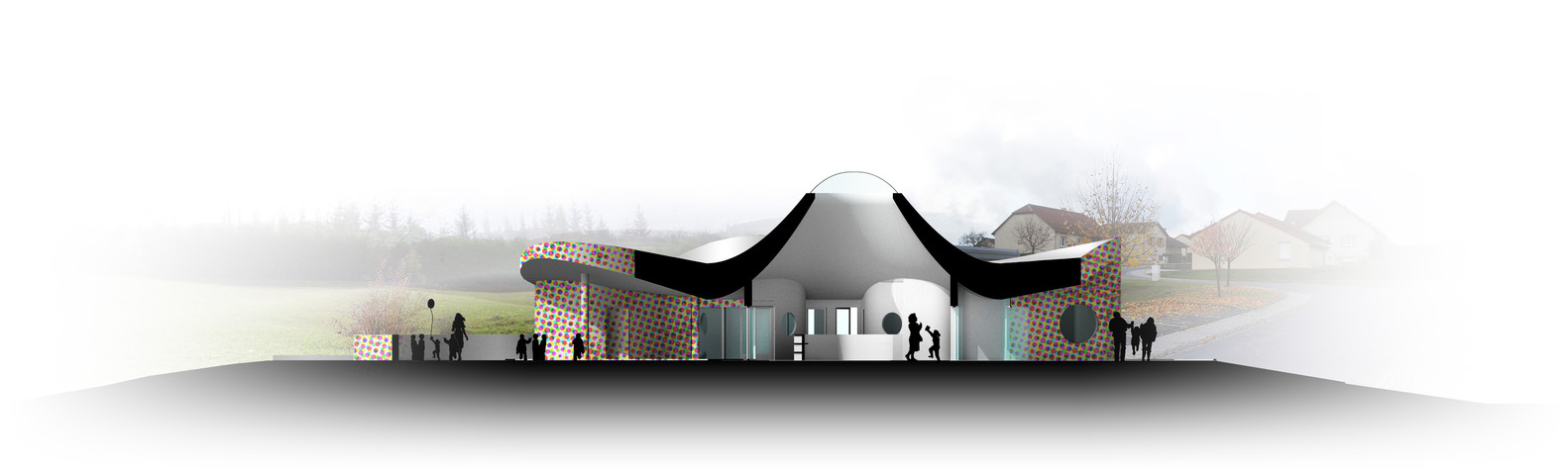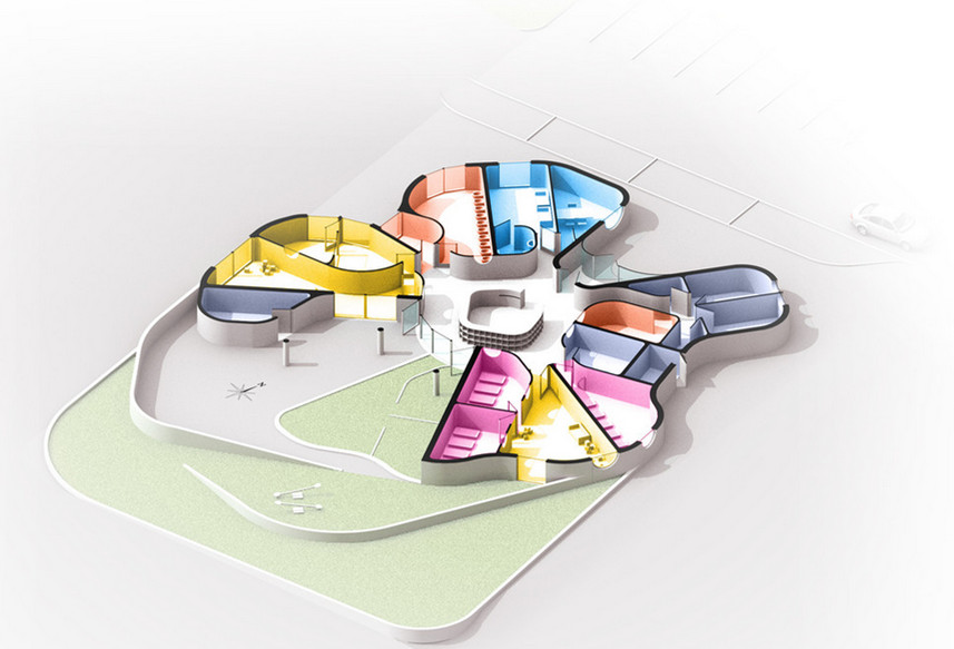 關(guān)于保育設(shè)施的設(shè)計,它是朝南的方位,這給了我們與環(huán)境的無縫集成的設(shè)想創(chuàng)造了一個平臺,我們的想法是讓這個結(jié)構(gòu)自然傾斜。每個平臺對應(yīng)像花園,游樂場,教育花園等功能...設(shè)施的造型體現(xiàn)了建筑的風(fēng)格,這簡直就像是是其它教育機(jī)構(gòu)所包圍的局面。我們的建筑物具有既不是“主立面”,也不是“背立面”的特點(diǎn),但作為一個整體,只有一個邊緣,它只有一個美學(xué)上均勻的外觀,其可以從周圍可見。
