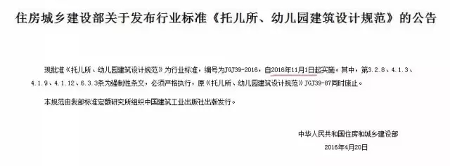 現(xiàn)批準《托兒所、幼兒園建筑設計規(guī)范》為行業(yè)標準,編號為JGJ 39-2016,自2016年11月1日起實施。其中,第3.2.8、4.1.3、4.1.9、4.1.12、6.3.3條為強制性條文,必須嚴格執(zhí)行,原《托兒所、幼兒園建筑設計規(guī)范》JGJ 39-87同時廢止。