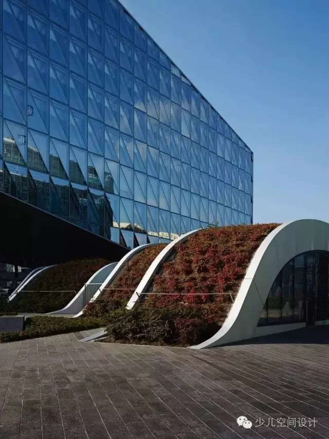建筑所采用的常規(guī)結(jié)構(gòu)及其交替起伏的形態(tài)在基地滿鋪,屋面被植株所覆蓋。這種手法在起伏的凸起部分形成遮蔽空間,凹面下則為室內(nèi)活動區(qū)域。Origami 幼兒園的特殊性質(zhì)源于這種重復(fù)的幾何規(guī)律形態(tài),設(shè)計(jì)師運(yùn)用了多種材料:金屬的窗戶豎框、橫梁與木材等。