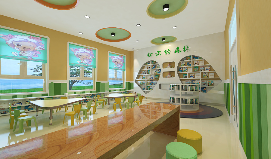 光滑干凈的長桌設(shè)計讓孩子們可以在鋪滿陽光的桌子上書寫畫畫的,明亮溫馨的環(huán)境孩子們也會更有學(xué)習(xí)的氛圍,孩子們圍著長桌一起讀書的畫面,想起來也是醉了,每個小細(xì)節(jié)的設(shè)計,卡通圖畫、簡約大方的書架....每個角度都是一副唯美的畫面。