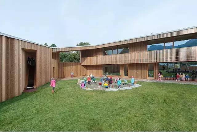 在小鎮(zhèn)的教堂附近,有一座新建的占地950㎡的幼兒園,幼兒園有一個(gè)大大的露天庭院,院里種植這草皮,還設(shè)計(jì)有一小塊沙地,孩子們可以在這小沙池中玩耍,靠近庭院的一面墻體的設(shè)計(jì)也是非常有意思,里面是安裝了木梯的攀巖墻,還有一部滑梯,所以即便是雨天,孩子們也可以在這個(gè)小天地里愉快的玩耍。幼兒園的設(shè)計(jì)也遵循著小鎮(zhèn)的風(fēng)格漆白的墻面外部用木材裝飾和周?chē)男℃?zhèn)建筑以及自然景物,和諧相融。