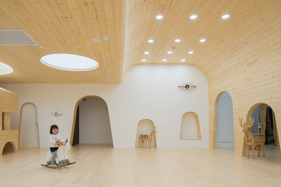 早教中心的設(shè)計(jì)分為地下室,一樓和二樓,地下室是老師們辦公和家長(zhǎng)培訓(xùn)的地方,一樓是孩子和家長(zhǎng)們的公共區(qū)域,采用白松木把地板和天花板的連續(xù)面包裹。這個(gè)空間就是孩子們被保護(hù)在世界的中心的小木屋,有個(gè)拱門去引導(dǎo)孩子們拾階而上,有飛鳥掠過,有樹屋還有鮮花和明燈,之后是教室,其實(shí)更像是一個(gè)新世界的小角落,讓孩子們?nèi)ヌ剿髦R(shí)。這就是寶媽精心打造的兒童空間。