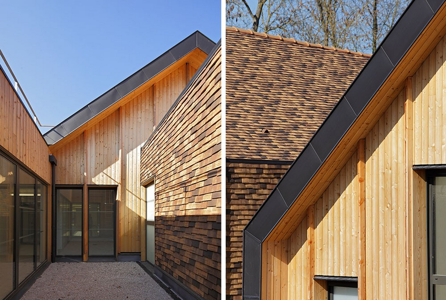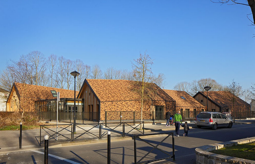 一座位于巴黎利耶于桑的幼兒園,設(shè)計師設(shè)計了大地色的陶瓷磚陶瓷磚的重疊像鵝卵石一樣覆蓋在獨特的坡屋頂建筑表面,裝點著幼兒園。覆蓋了整個幼兒園的屋頂和墻壁,遠遠看去就像是聚集在一起長滿鱗片的建筑群。