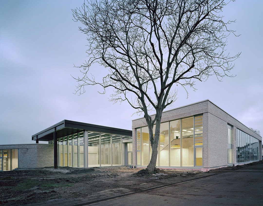 幼兒園中間的方體扭轉(zhuǎn)鏈接兩個不同方向的建筑,呈兩翼展開,在幼兒園室內(nèi)的空間有明細(xì)的規(guī)劃,1-3歲的30個小孩的日托空間布置在南側(cè),4–7歲100個小孩的日托空間布置在北側(cè)—這里每間教室的層高都是雙層,更衣間和壁柜放在屋子的后側(cè)。這兩翼建筑通過中間的扭轉(zhuǎn)方體連接,方體的功能是多功能房和餐廳。所有主要的房間都設(shè)置了落地玻璃窗,讓花園和周圍歷史環(huán)境一覽無余。