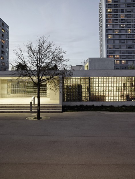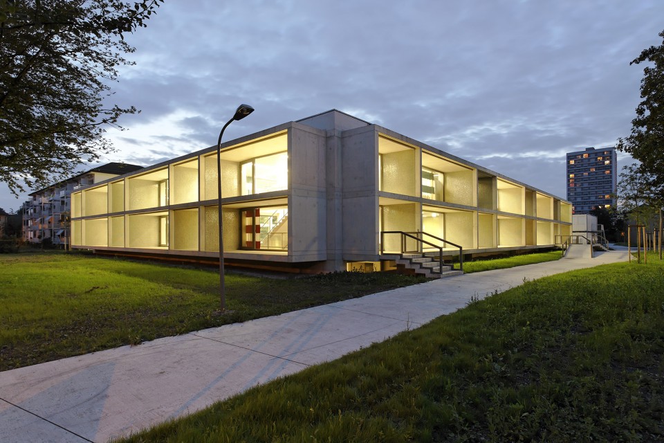位于瑞士蘇黎世Hirzenbach區(qū)域的城市結構如同花環(huán)般層次分明,外圍的公寓樓高低起伏,環(huán)繞著中間開闊、平坦而低矮的學校建筑。而由Basler & Hofmann事務所所新建的建筑意在加強現(xiàn)有城市肌理的邏輯關系,在學校的北面建起了一座僅僅有一層高的幼兒園,而南邊的半下沉體育館則充分考慮了其作為開放性公共空間的通透性。