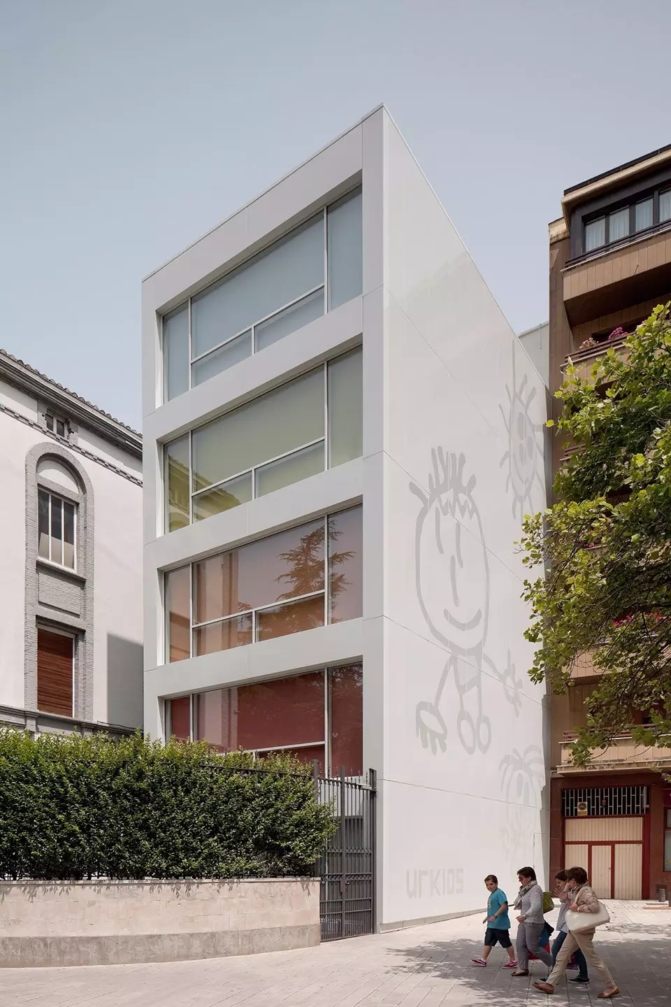 很多幼兒園都是占地面積廣闊,空間很大,但是有一所特別的幼兒園是特例,他就是UrKids幼兒學(xué)校,幼兒園是一棟白色五層高樓,就像是人們說的紙片樓,而設(shè)計(jì)師們則是把入口建在了建筑的長邊上。