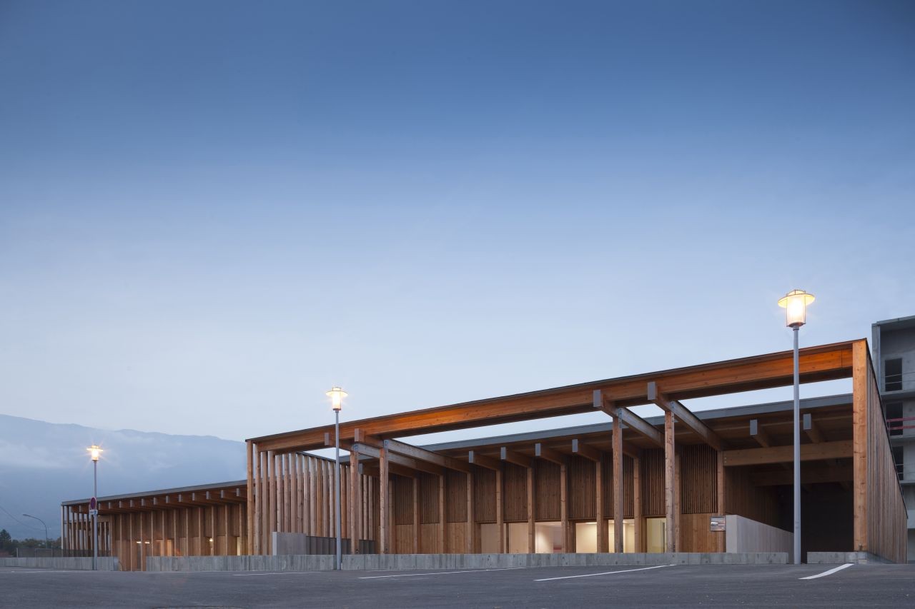 木材因生態(tài)與經(jīng)濟(jì)而被選中。作為自然而可再生的材料,它對(duì)健康沒(méi)有任何風(fēng)險(xiǎn),同時(shí)最大限度減少了碳排放。用于建筑的落葉松木可以采用高水平的預(yù)制,同時(shí)無(wú)論是建筑立面或其內(nèi)部結(jié)構(gòu)都不需要其他處理。北邊的木結(jié)構(gòu)和天井與混凝土相結(jié)合,從而保證最優(yōu)的保溫性能,同時(shí)尊重了防震需求。木結(jié)構(gòu)間充滿了粉刷與亞麻,從而獲得了高性能保溫墻體。建筑的密封性從早期研究到建筑工地都一直得到了重點(diǎn)關(guān)注。