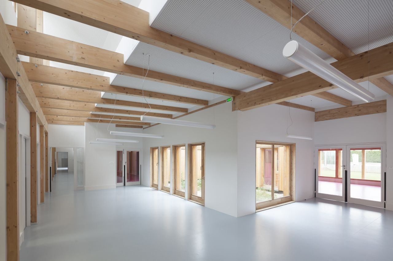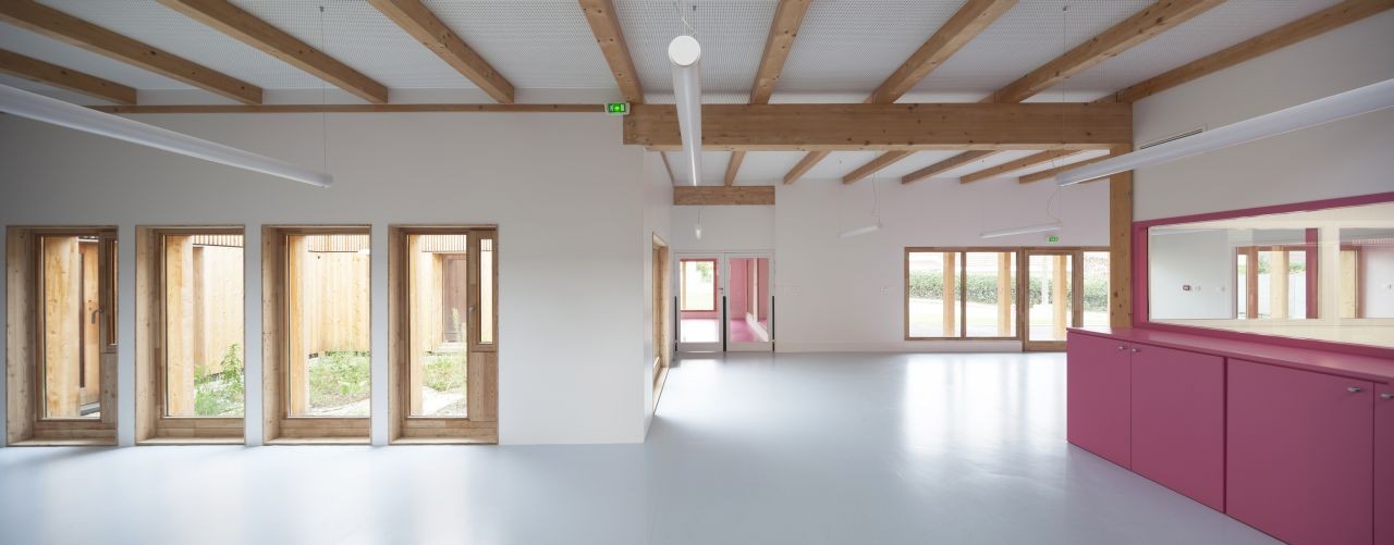 一所幼兒中心坐落在綠色而原始的圣格尼斯·普伊郊區(qū),緊鄰著日內(nèi)瓦與歐洲核子研究中心,并且正好位于法國(guó)與瑞士的邊界。在幼兒中心內(nèi)部,木結(jié)構(gòu)和自然光賦予空間以節(jié)奏。重復(fù)的結(jié)構(gòu)允許精確裝配細(xì)節(jié),因此這些細(xì)節(jié)也成為定義建筑室內(nèi)的元素。白色粉刷墻和帶有顏色提示的設(shè)施整合了孩子們的玩具與家具。體量和與線條的簡(jiǎn)單與適當(dāng)?shù)谋壤m應(yīng)于孩子們的生活和視野,同時(shí)提供了寧?kù)o而歡迎的設(shè)想,有意避免了任何“幼稚”的內(nèi)涵。