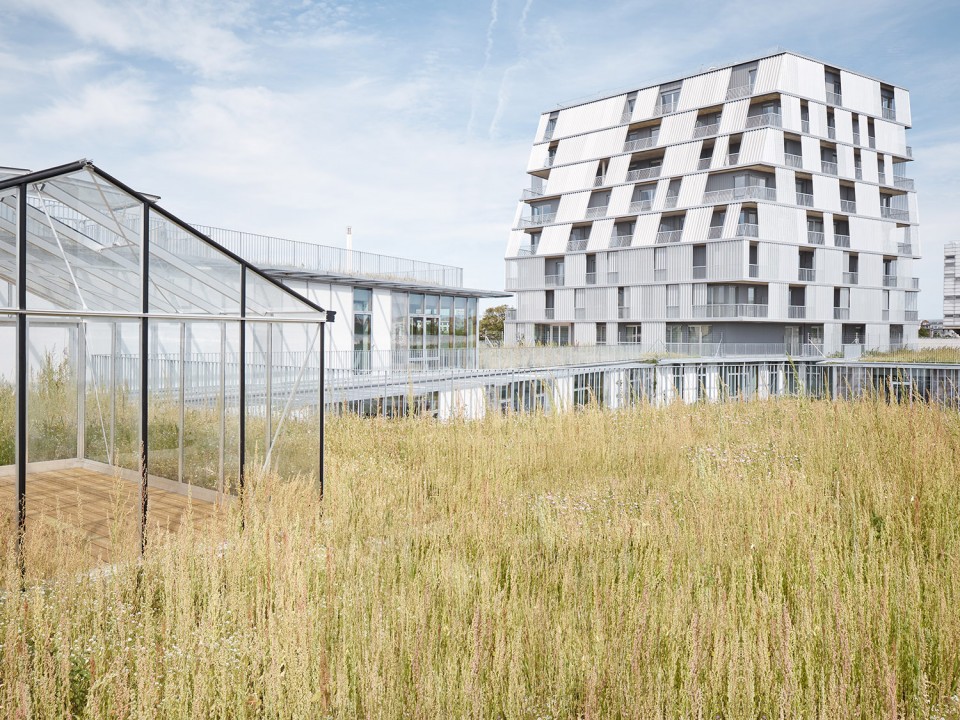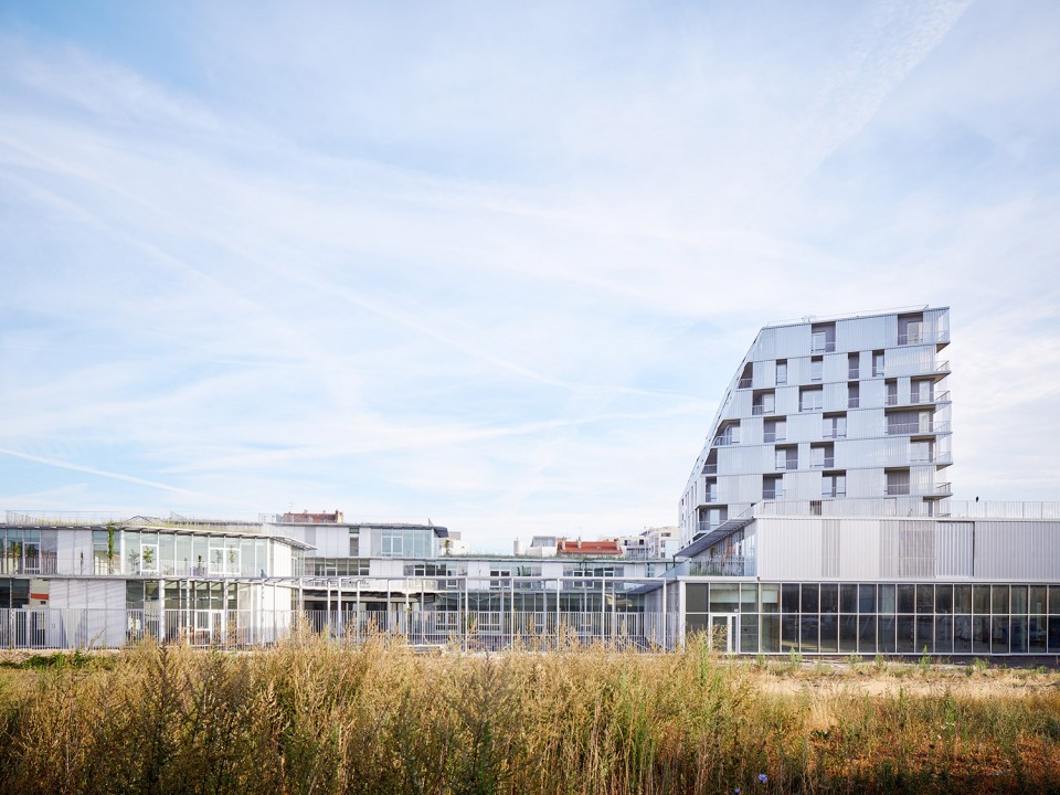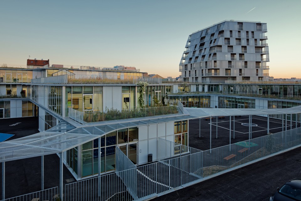 學(xué)生宿舍的設(shè)計(jì)基于4個(gè)主要建筑學(xué)原則。首先,項(xiàng)目作為一個(gè)整體要具有合理的功能(結(jié)構(gòu)和技術(shù)空間的疊加),同時(shí)還要緊湊。距離其他功能分區(qū)的距離使它有所脫節(jié),具有一定的獨(dú)立性。由于宿舍區(qū)被設(shè)置在盡可能北的方位,最窄的立面朝向Jean-Jaurès大街,平臺(tái)不會(huì)阻擋陽光進(jìn)入室內(nèi)。這也保證了操場(chǎng)能夠享受足夠多的陽光。
