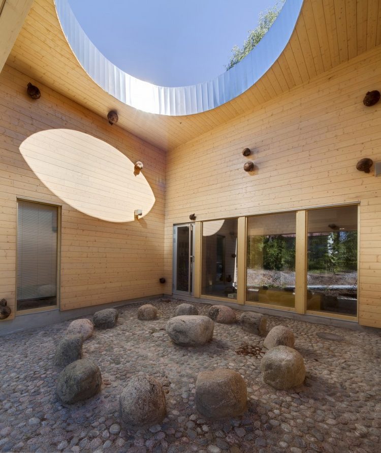 整個建筑鋪砌一新的內(nèi)部庭院朝向門廳開放,會內(nèi)的天花板上有一個巨大的露天圓形開口,隨著時間的推移使得移動的陽光成為了室內(nèi)庭院中一道亮麗的風景,庭院內(nèi)還有這藝術(shù)家創(chuàng)作由20個落葉松木制作的球體組成,代表著宇宙的雕像。(幼兒園室內(nèi)設(shè)計)