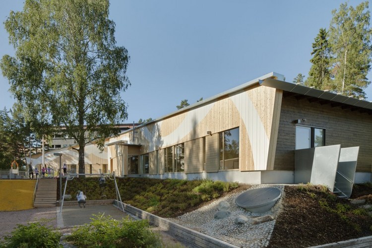 Omenapuisto日托中心位于芬蘭赫爾辛基,整個建筑主要的由單層體量構(gòu)成,兩層高的部分是一個多功能的高挑空間,并且在這個空間設(shè)計有著一個通風裝置室和陽臺,整個建筑所在場地非常狹窄,項目的目標是打造輕盈開放的體量,屋頂吵兩個方向緩緩傾斜每一端都有一個大水槽將雨水排放到石頭鋪砌的水池中,并由此滲入地面,場地內(nèi)水平高度的自然差異被用作坡道,與相鄰的道路形態(tài)相呼應(yīng)。(幼兒園設(shè)計)