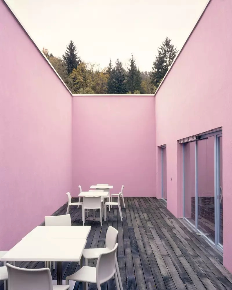 通過巧妙地對日托中心內空間環(huán)境的結構排列,例如散步區(qū)和寬敞的操場位置的安排,使日托中心呈現(xiàn)出了一種平面拉抻式的獨特空間感覺。在外觀表面的內側,則是一個封閉的景觀環(huán)境,一層半高的高度設計,利用孔洞結構提供了一個與外界主馬路相隔離的封閉式屋頂景觀。