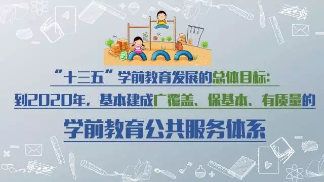 《意見》對(duì)“十三五”學(xué)前教育改革發(fā)展做出了全面部署,提出了“十三五”學(xué)前教育發(fā)展的總體目標(biāo):到2020年,基本建成廣覆蓋、保基本、有質(zhì)量的學(xué)前教育公共服務(wù)體系。