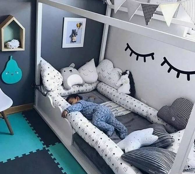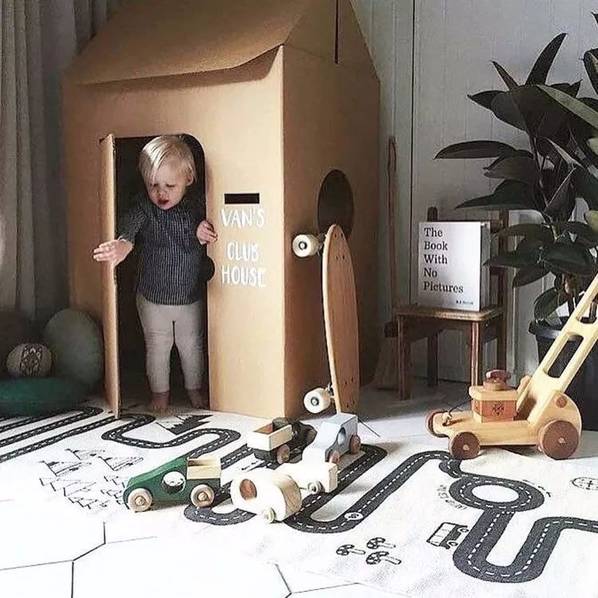 房間里還可以設(shè)置一些簡(jiǎn)易的玩樂(lè)設(shè)施。1-3歲的孩子需要父母的時(shí)刻陪伴,我們可以在房間或者客廳放上爬行墊+安全圍欄給孩子一個(gè)小區(qū)域領(lǐng)地,把這里變成一個(gè)親子小游戲區(qū)。在兒童房里也可以在地面貼上玩具貼紙,把局部地面變成孩子的游戲地圖,適合在游戲中培養(yǎng)孩子創(chuàng)造力和分享的意識(shí),留出空間,讓孩子可以和朋友或者和父母一起玩玩具,孩子1歲之后我們可以適當(dāng)添置一些矮柜來(lái)收納玩具,還可以讓孩子扶著學(xué)走路。在兒童床上加一個(gè)木架結(jié)構(gòu),把床做成木房子,給孩子一個(gè)開(kāi)放的獨(dú)立空間。這種具象的區(qū)域不僅會(huì)給孩子安全感,還能滿足他們的探險(xiǎn)欲,