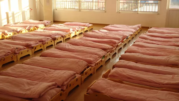 為節(jié)省面積,便于使用,幼兒園床位排列常采用兩床相靠或成組排列方式,但并排床位不應(yīng)超過2個(gè),相接床位不宜超過4個(gè)。
