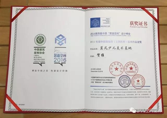 2016年12月,由中國(guó)建筑裝飾協(xié)會(huì)指導(dǎo),CCSD中國(guó)營(yíng)造空間設(shè)計(jì)師俱樂(lè)部、《飾界人物》雜志社主辦,北京大易尚陽(yáng)管理咨詢有限公司承辦,聯(lián)電國(guó)際、輝樂(lè)豪銅門、小狗電器共同協(xié)辦,各地裝飾協(xié)會(huì)、中央電視臺(tái)、中裝新網(wǎng)、瑞麗家居、《建筑技藝》雜志社、《飾界人物》雜志社、中華建筑報(bào)等數(shù)十家媒體聯(lián)合支持的“2016第四屆中國(guó)‘營(yíng)造空間’設(shè)計(jì)峰會(huì)”在北京天倫王朝酒店正式拉開(kāi)了帷幕。集合設(shè)計(jì)項(xiàng)目“莫凡少兒美術(shù)基地”榮獲此次“營(yíng)造空間”的設(shè)計(jì)金獎(jiǎng)。