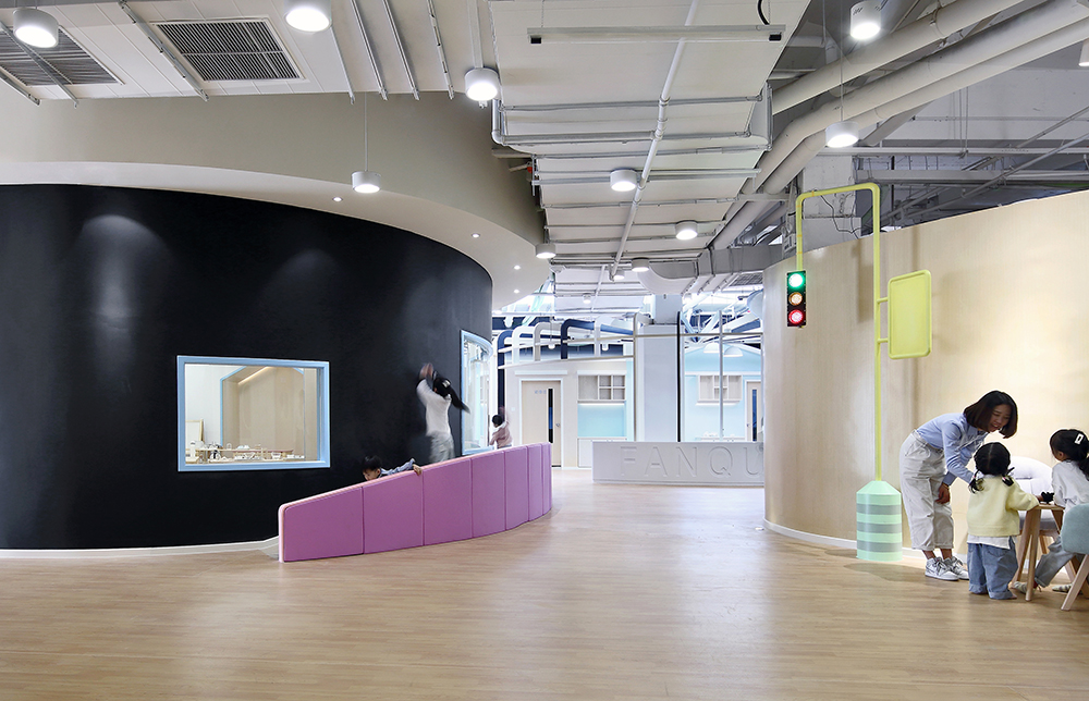 場地總面積有2000㎡,充分的條件讓我們能夠?qū)ⅰ俺鞘薪ㄖ边@個宏觀的概念和很多設(shè)想落地。如果將番趣兒童成長中心看作一座城,我們該怎樣去搭建城市?