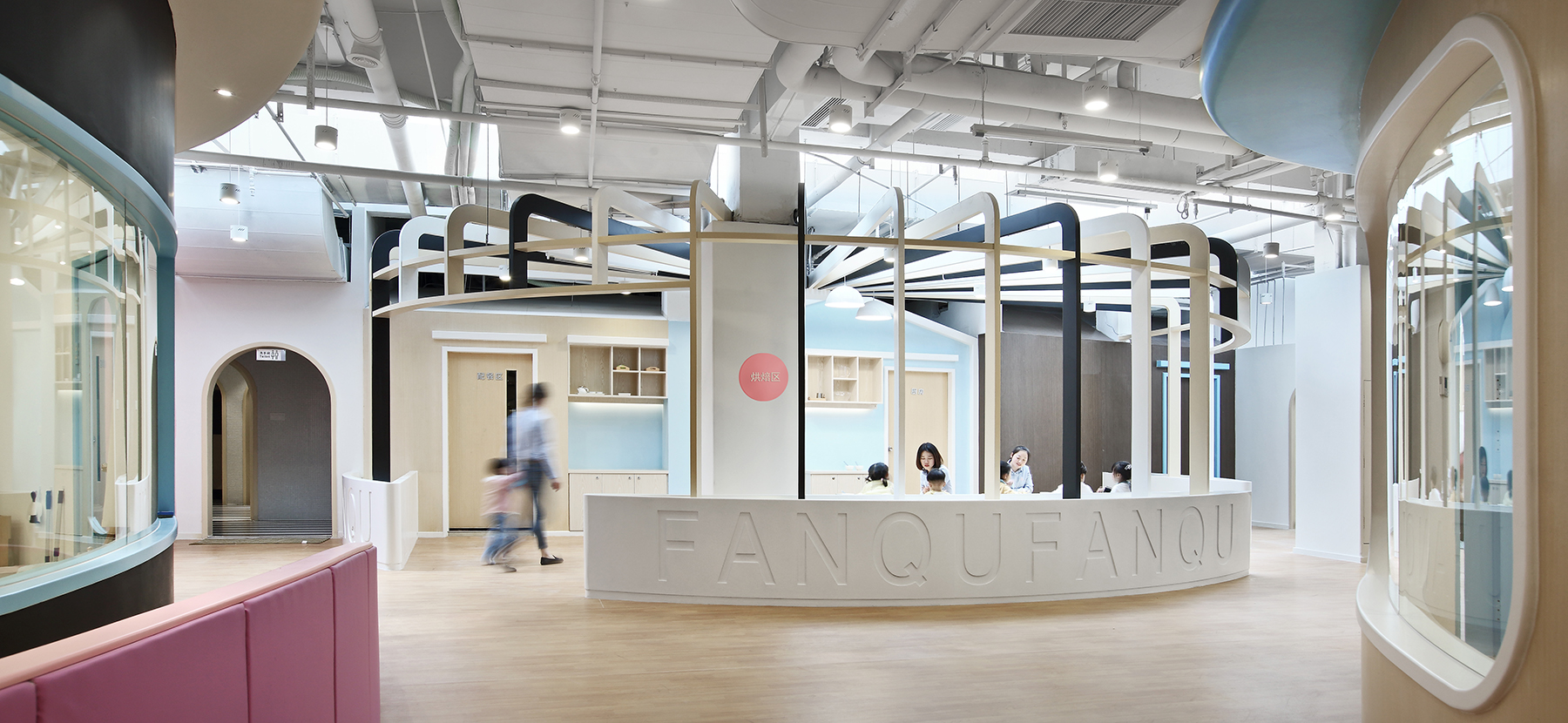 設(shè)計師延伸“番趣”的品牌形象,打造項目主入口外觀,品牌元素與園區(qū)的展示需求相融合,構(gòu)成明凈活潑的外觀形象。門頭和前臺造型取自品牌“F”元素,以親切的姿勢歡迎小朋友和家長的到來。