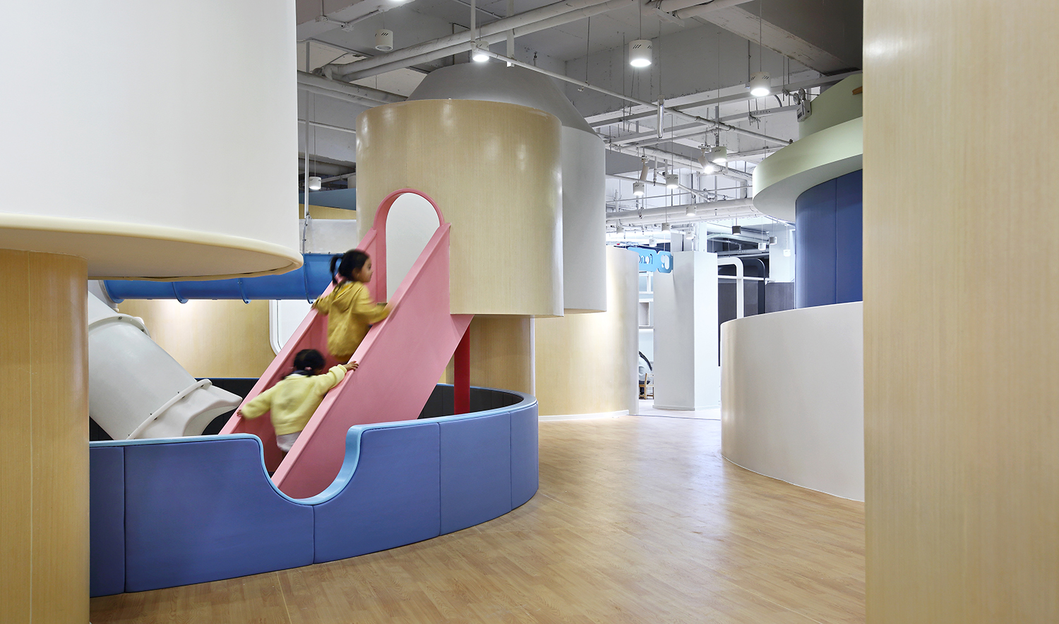 游戲是孩子的活力之源,也是孩子通往世界的途徑。設(shè)計師將游樂區(qū)布局在室內(nèi)的中心位置,讓孩子的歡聲笑語激活整座“城”。孩子們會帶著好奇和期待爬上梯子,穿過可愛的小木屋,在管道中匍匐前進,然后“咻”地一下滑入下沉的球池,在不斷變化動作和愉悅的體驗中獲得身心的鍛煉和能力的發(fā)展。