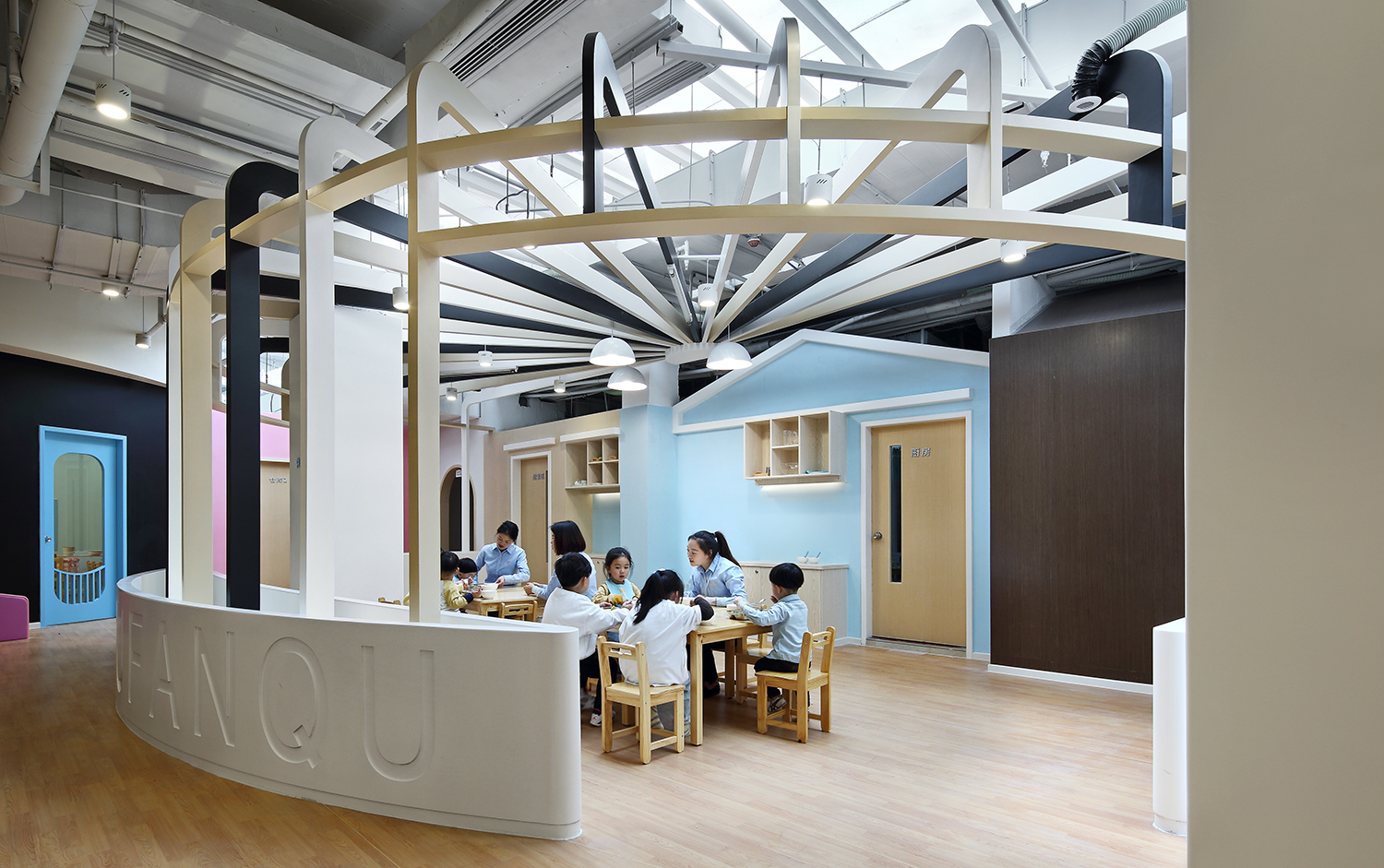 設(shè)計師將室內(nèi)采光最充足的區(qū)域留給餐廳、繪本區(qū)等公共區(qū)域,同時打造開放感,以此盡量延展陽光在成長中心的照射范圍。當(dāng)陽光進來,仿佛天燈將整座城市點亮。孩子們能夠在陽光下活動,吃飯、讀書、玩樂,隨著時間的變化觀察光影,感受陰晴雨雪和四季變化。