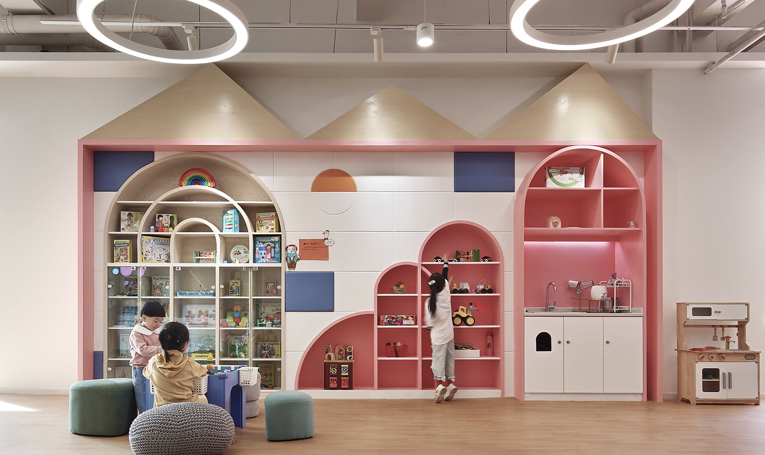 設(shè)計師將這些單個場所及其代表性元素,一一落實到番趣兒童成長中心后,不僅形成了有趣的分區(qū)和大量多元化的小角落,還驚喜地產(chǎn)生了很多趣味性的視覺呈現(xiàn)。室內(nèi)的承重柱也不知不覺被設(shè)計師巧妙隱藏了起來。