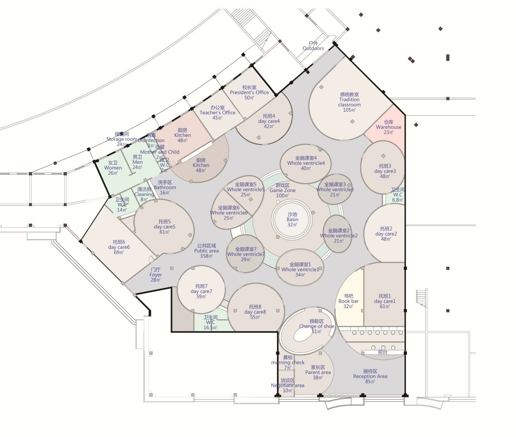 此次設(shè)計涉及早教和托育兩大版塊功能需求,包括16間教室、1個游樂區(qū),以及書吧、辦公區(qū)、廚餐區(qū)等。設(shè)計師將原有場地進行清理和重新分割,根據(jù)項目需求和場地情況將中部規(guī)劃為早教區(qū),托育教室則圍繞早教區(qū)環(huán)形安置,主門在南面,接送門在西側(cè)。