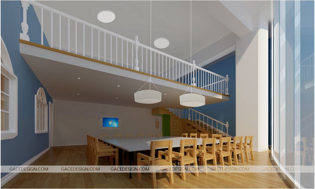 幼兒園的教室、通道及其他活動空間是建筑師依據(jù)相應的活動流量、人體工效學和建筑標準設計的,而繁多的家具、教具和玩具設施,往往與有限的空間產(chǎn)生沖突。保證兒童有寬敞的活動場地是幼兒園裝修要考慮的重點之一。在裝修設計時充分注意到這點,利用建筑物的墻角與門后形成的零碎空間,設計制作儲物柜、櫥、小擱架等,把大空間留出來,不僅使幼兒活動空間寬敞、安全,也形成一種視覺上的完整、流暢和通透。小班活動室中搭建的小閣樓正是基于這一思想設計的。閣樓上下形成兩個相對獨立的活動空間,使教室的活動空間增加了近三分之一。