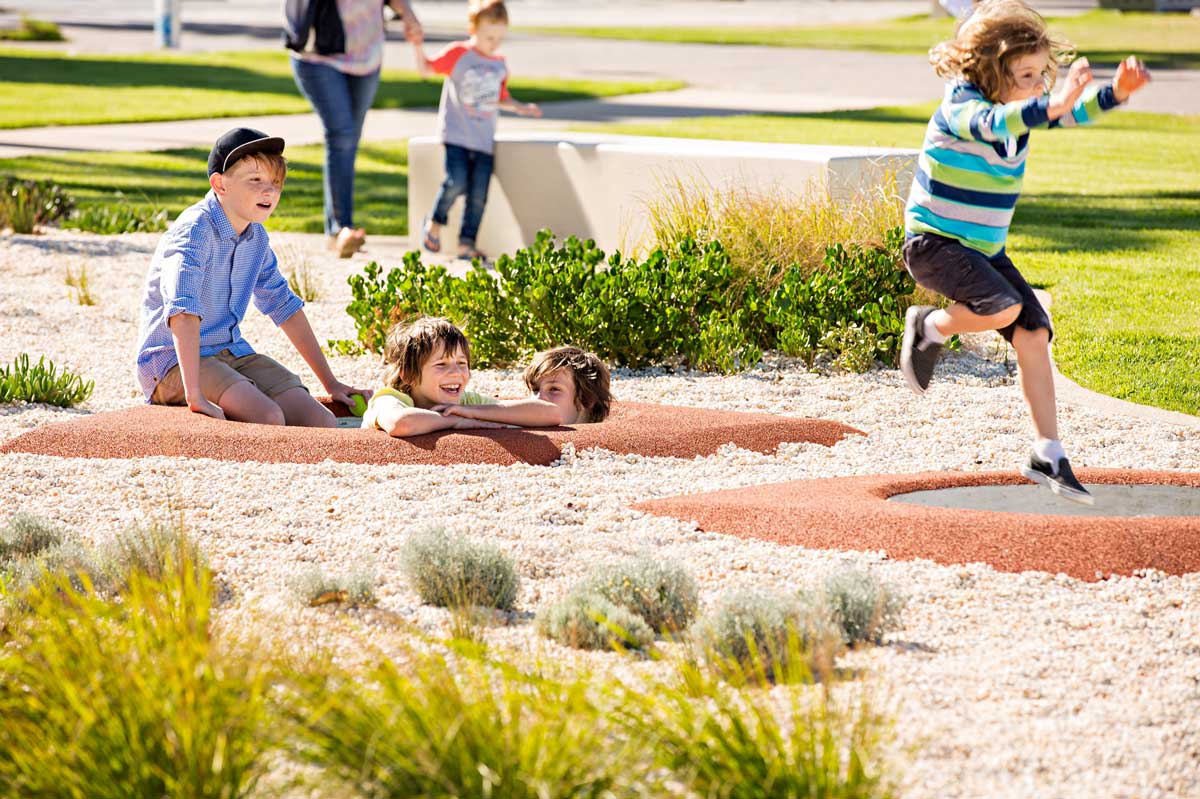 可持續(xù)性原則應用到這個項目中的各個方面。所有現(xiàn)存的樹木都得以保存,想要種植無數(shù)個樹木設置陰涼。設計師選擇當?shù)乇就林参镌鎏砩锒鄻有???稍偕牧弦灿糜谠S多游樂元素中,木材和繩索取代鋼鐵和塑料。大部分的設備是特制的、建于澳大利亞,WAX事務所與當?shù)厣a(chǎn)商合作建造出預制的游樂元素。