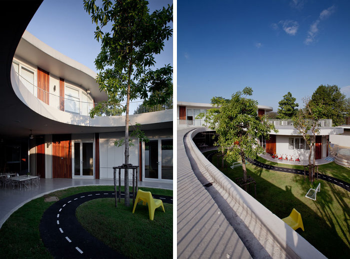 有一所有趣的幼兒園,這個(gè)院子里有著耀眼白色跑道的肯辛頓國(guó)際幼兒園位于泰國(guó)曼谷,在2012年的時(shí)候完工。項(xiàng)目主旨在于激勵(lì)孩子們用自己的空間想象感知找到玩樂(lè)的趣空間。
